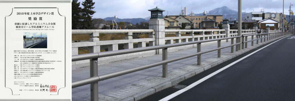 アスレールは、2010年度土木学会デザイン賞奨励賞を受賞しました。これまで土木構造物や土木事業を中心とした街並み整備を対象としてきた土木学会デザイン賞10年のあゆみの中で、初めて汎用性の高い標準製品が表彰されました。日軽エンジニアリングでは今後も美しい景観づくりに努めてまいります。