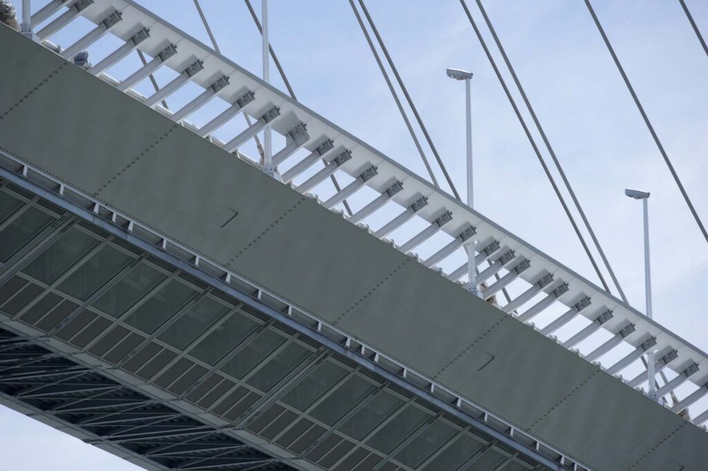 導流板(抑流板・導風板)とは、橋桁の風下に出来る空気の渦による橋の振動(渦励振)を抑制する目的で設置されるフラップです。飛行機の離陸時に揚力を確保する可動翼片「フラップ」の原理を応用し、桁の左右に突き出すように設置することで桁の揺れを軽減します。