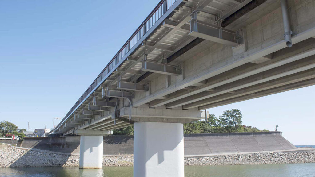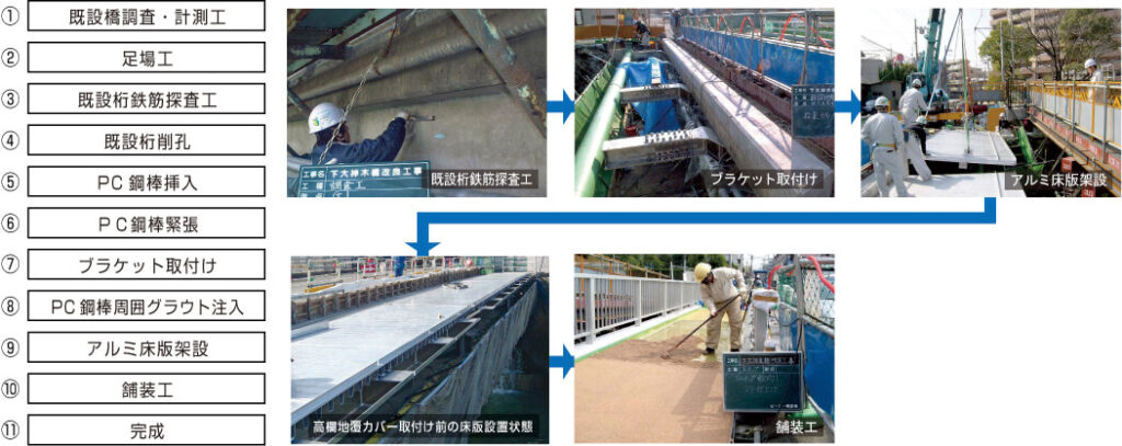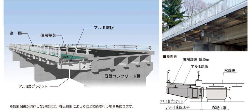 道路・橋梁 都市景観・建築 港湾・河川・上下水 コンクリートブラケット方式 新志原橋拡幅 三重県 コンクリート橋、PC 橋にアルミ製ブラケットを介し、アルミ床版を添架させる工法です。 ブラケット取付け部は、PC 鋼材や鉄筋の位置を入念に調査して決定します。 また、ブラケット取付け部には、荷重分配のためコンクリート横桁を設置します。 適用形式:コンクリート橋/PC橋 施工手順 水戸橋╱鹿児島県(国土交通省鹿児島国道事務所)2009年度施工/W=2.0m L=66.0m 新志原橋 三重県2019年度施工/W=2.0m L=99.0m 上柳橋(下流側) 広島県( 広島市南区役所)2020年度施工/W=3.5m L=88.3m 日奈久港人道橋 熊本県(八代土木事務所)2009年度施工/W=2.0m L=43.0m