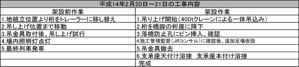 ●輸送制限により、1列を3分割して工場製作し、現場へ搬入。駅線路脇の現場ヤードにて分割された箱桁を現場溶接し、横桁を高力ボルトに