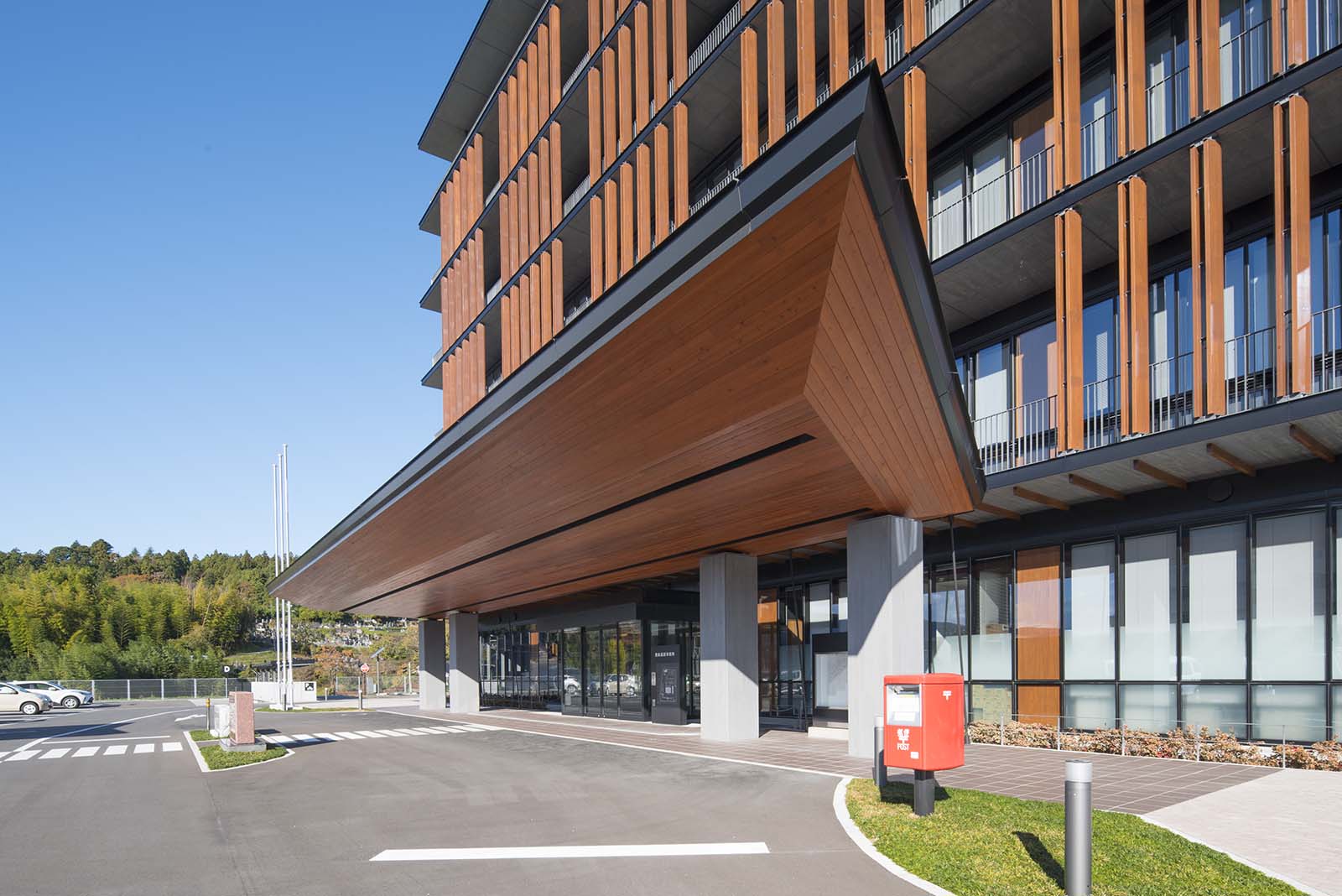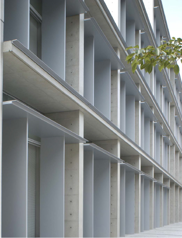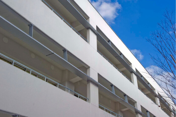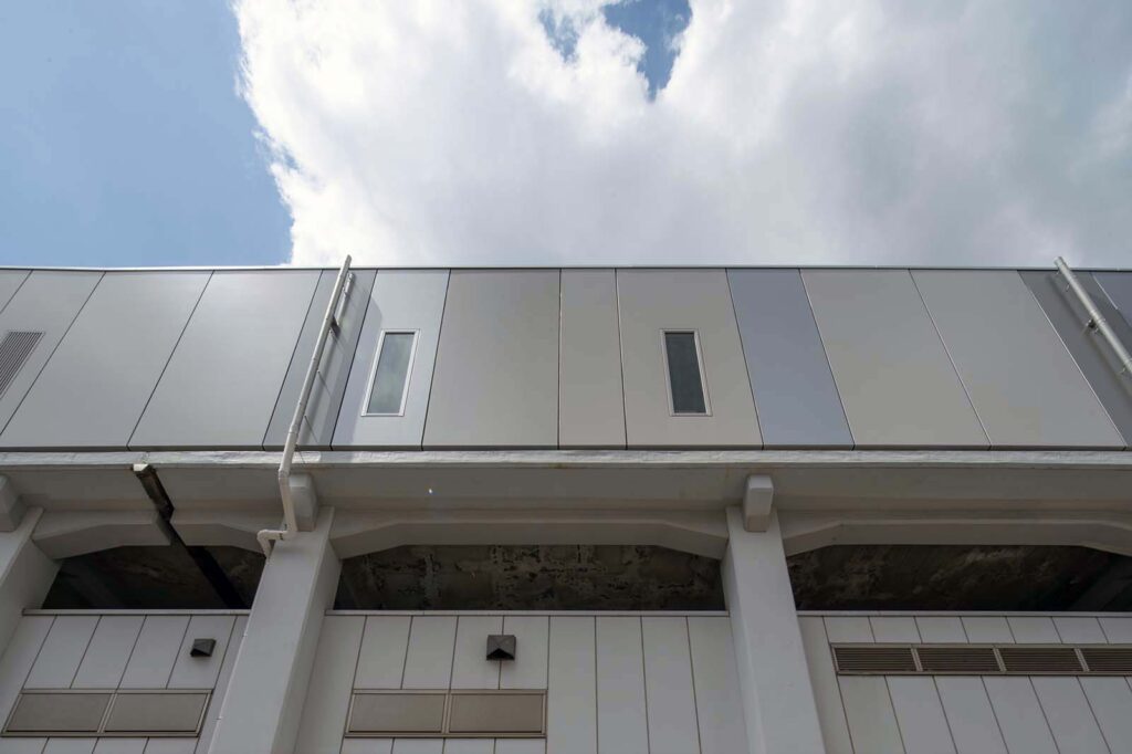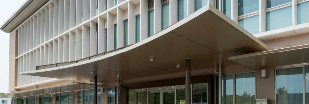 アルミハニカムパネルの庇・屋根やアルミ製外装板は、耐候性、機能美にも優れ、エレベーター棟を美装化できます。また、採光性や防犯性などにも考慮しながら、ガラスなど他素材との組合せもご提案します。このほかエレベーター塔以外にもカーテンウォール等の建築外装も承ります。