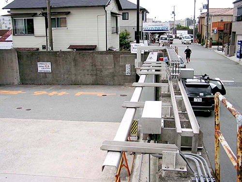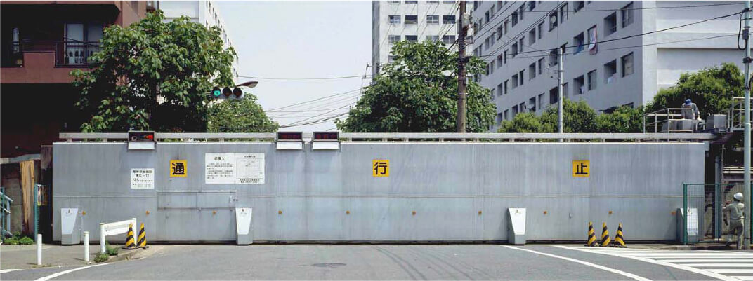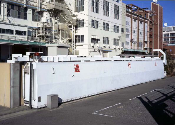 扉体の車輪によって移動開閉させるゲートです。現在、陸閘はアルミ製が一般的ですが、軽量なため大型でも人力で動かせます。また、遠隔操作できる電動式もあり、新設はもちろん既設陸閘の改良も対応可能です。引戸式は格納スペースを必要としますが、開閉操作が安全確実で、主に高潮、津波対策として数多くご採用いただいています。