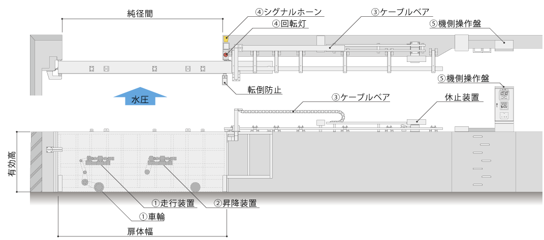 純径間:18.5m/有効高:3.0m/駆動方式:ラックピニオンによる全自動式 電動油圧昇降/扉体重量:17,000kg