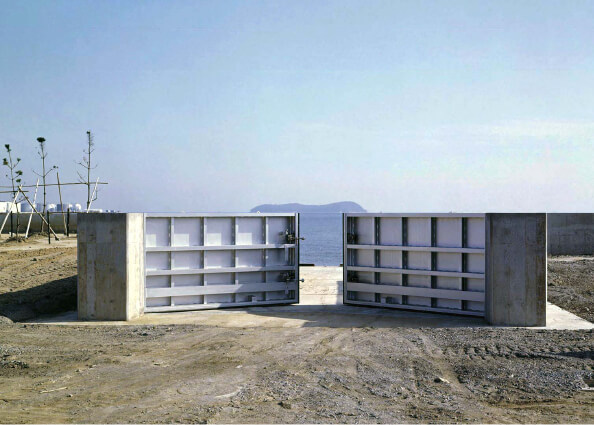 2枚の扉体で構成し、それぞれの扉体外側上下に設置したヒンジを中心に旋回させ、中央で合わせるゲートです。主に高潮、津波対策として数多くご採用いただいております。