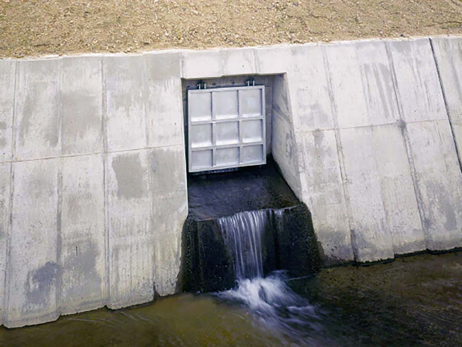 扉体上部にヒンジを設け、内外水位差によって自動開閉する樋門用ゲートです。バランスウエイトにより扉体が少し開いた状態を保持すると共に、増水時はフロートによって自動閉鎖します。