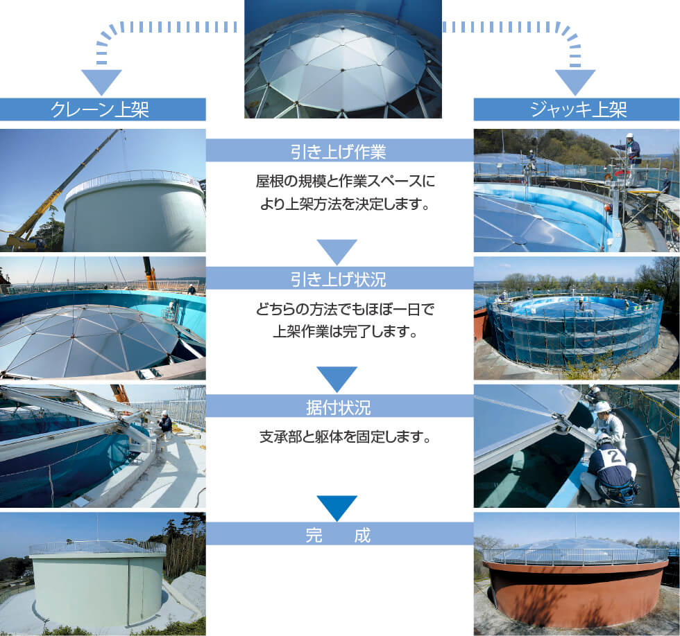ドームトラス工法の屋根は水槽内外で組み上げたのち、クレーン又はジャッキにより上架します。